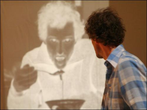 Sur un des négatifs projetés, on le distingue à peine, couché qu’il est sur un amas de draps, si bien qu’il doit montrer au public le contour de sa silhouette, perdue dans les échelles de gris et les drapés avec laquelle elle semble fusionner. Ses négatifs suscitent en tout cas chez l’artiste l’évocation, entre autres, de son atelier de peintre, de sa famille, de sa ville natale de Rotterdam et ses ressortissants « célèbres » (dont je ne connaissais, pour ma part, qu’Erasme…).